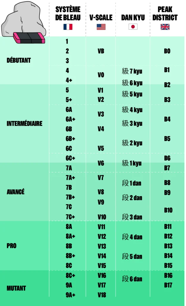 En escalade, les cotations permettent d’attribuer une difficulté à un bloc pour permettre à chacun de comparer ses différentes réalisations sur une échelle commune. En escalade de bloc, le monde est divisé autour de 3 systèmes de cotations principaux:
